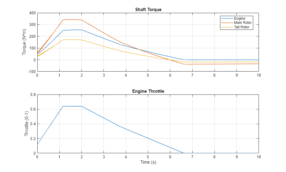 The plots below show the torque supplied by the engine and the torque applied to the rotor shafts. The engine is permitted to stall after 6 seconds. Induced and profile drag on the spinning rotors act to slow them down.