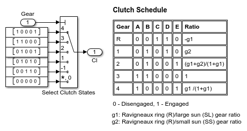 This model shows a test harness for a Ravigneaux 4-speed transmission. The subsystem uses the Ravigneaux Gear block and five friction clutches to implement four forward ratios plus reverse. Meshing losses are enabled in the Ravigneaux gear. The clutch states required to implement the different ratios can be viewed by opening the Clutch Schedule block.