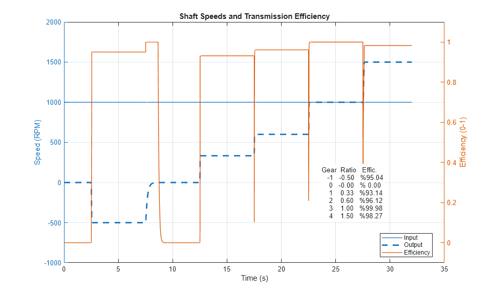 The plot below shows shaft speeds and overall transmission efficiency as the transmission is cycled through each of its gears. The input shaft is turned at a constant speed. The table in the lower right shows the steady-state values for gear ratio and efficiency for each gear.