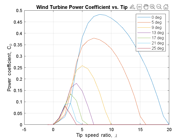 % Retrieve the model data hws= get_param('WindTurbineDrivelineWithVibrations', 'modelworkspace'); rotor= getVariable(hws, 'rotor'); % Generate the plot figure; hold on for i=1:length(rotor.pitch) plot(rotor.TSR, rotor.Cp(i,:), 'DisplayName', [num2str(rotor.pitch(i)) ' deg']) end box on grid on legend show title('Wind Turbine Power Coefficient vs. Tip Speed Ratio') xlabel('Tip speed ratio, \lambda') ylabel('Power coefficient, C_p');