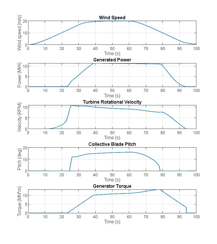 The script below uses results from Simscape logging to plot the wind speed, generated power, turbine rotational velocity, blade pitch, and generator torque in a figure. When the wind speed increases above the rated wind speed, the blade pitch increases to limit the aerodynamic power. When the turbine rotational velocity decreases in response to the increased blade pitch, the generator torque increases to maintain the rated power. When the wind speed decreases, the pitch controller decreases the blade pitch, and the turbine rotational velocity decreases at a faster rate. The generator torque decreases when the generated power is below the rated power.
