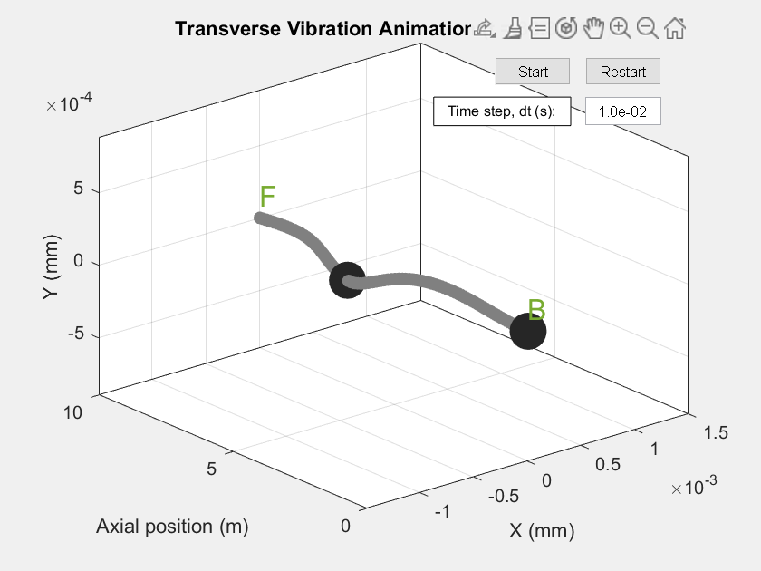 Click the button below to simulate the model and run an animation of the shaft transverse vibrations. The button generates a standalone figure for running the animation. The image below is a screenshot of the animation.