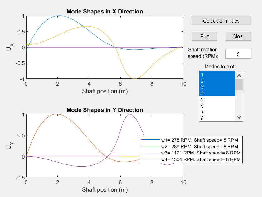 The script below plots the shaft eigen mode shapes and frequencies for varied shaft speeds. Modes with large displacements at the axial locations excited by external loadings and modes with natural frequencies equal to the shaft speed or external loading frequencies will have larger vibration responses, and you generally want to avoid designs with these characteristics. The button generates a standalone figure for plotting the mode shapes. The image below is a screenshot of the figure.