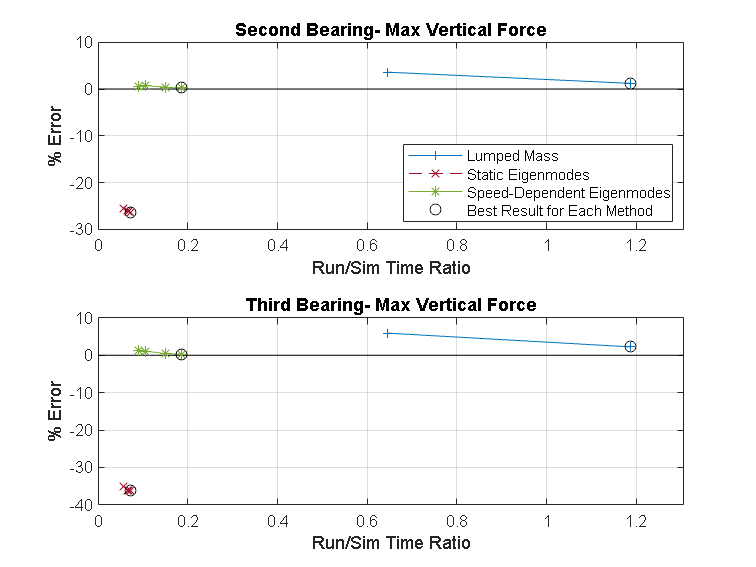 The speed-dependent eigenmode method computes the eigenmodes of the shaft-bearing-disk system at varied reference shaft speeds. During the simulation, the model updates the modal properties as speed-dependent gyroscopic and bearing properties change to improve simulation accuracy.