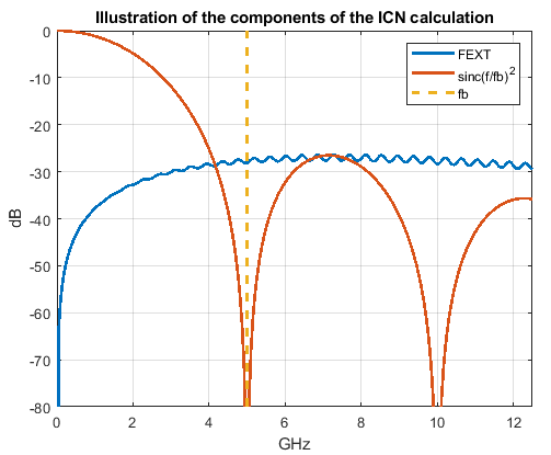 ICN is a frequency domain metric where the crosstalk is multiplied by a weighting function and then numerically integrated from 50 MHz to the baud rate (fb). If there are multiple aggressors, their power are summed together before combining with the weighting function.