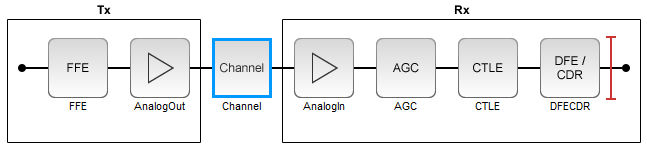 In a new blank canvas, add an FFE block to the Tx side. Add an AGC, a CTLE and a DFECDR block to the Rx side.