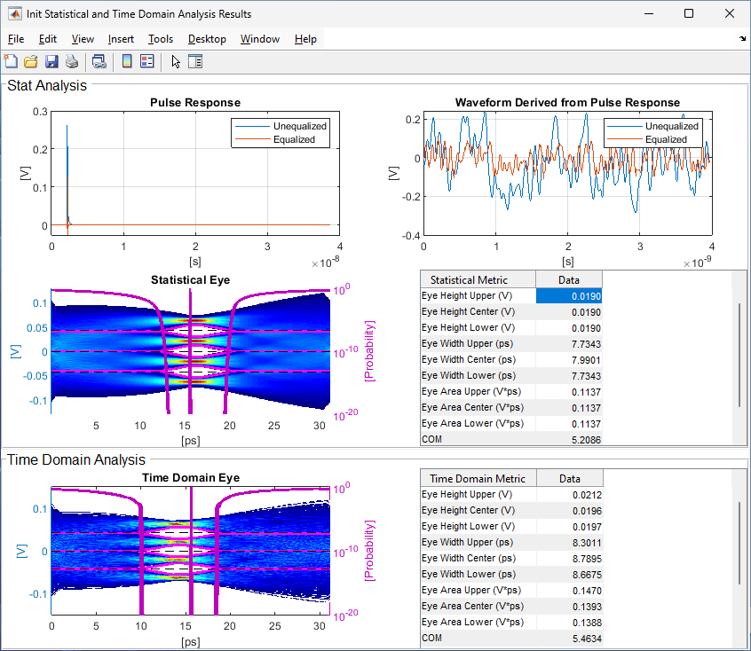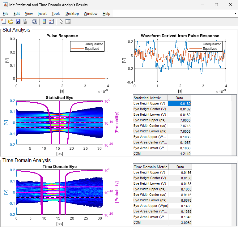 Run the model. When complete, you can see the statistical eye data displayed for each metric. Please take note of one or two of the metrics, because during the next step you will see how changing the targetMetric can affect optimization.