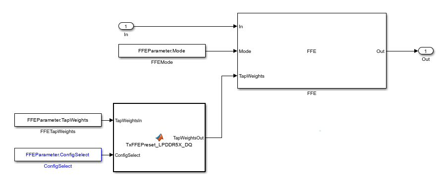 • Connect the FFEParameter.TapWeights constant block to the TapWeightsIn input to the function TxFFEPreset_LPDDR5X_DQ.