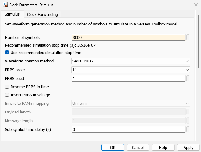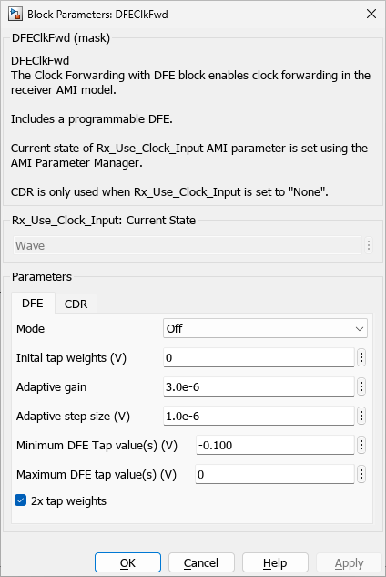 • Note: This block will be replaced by the DFEClkFwd block to support IBIS Clock Forwarding functionality after exporting to Simulink.