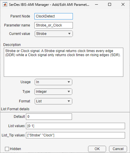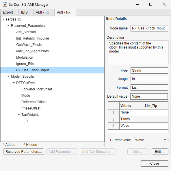 Navigate to the AMI - Rx tab in the IBIS-AMI Manager, and create new Parameters for the following under the Model_Specific entry for ClockDetect that was created above.
