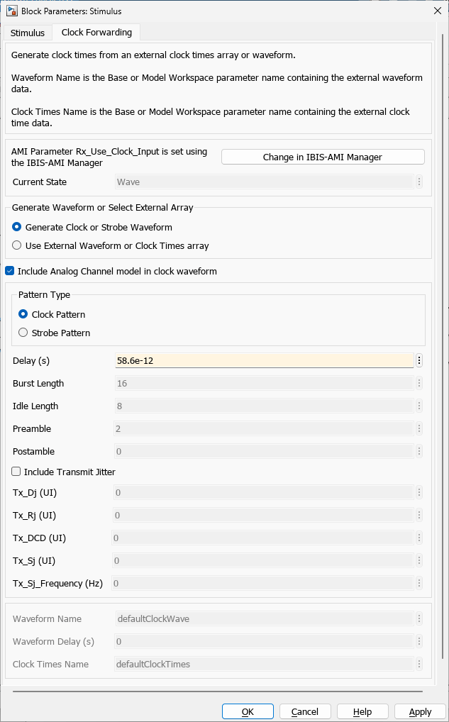 Next, set the following Block Parameters for IBIS-AMI clock_times block: