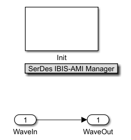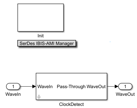 Next you will setup the clock receiver subsystem to add a zero-crossing detector to output clock times for IBIS Clock Forwarding support. Double-click on the Rx block to open the Rx subsystem. Put down a pass-thru block. Rename the pass-thru block ClockDetect.