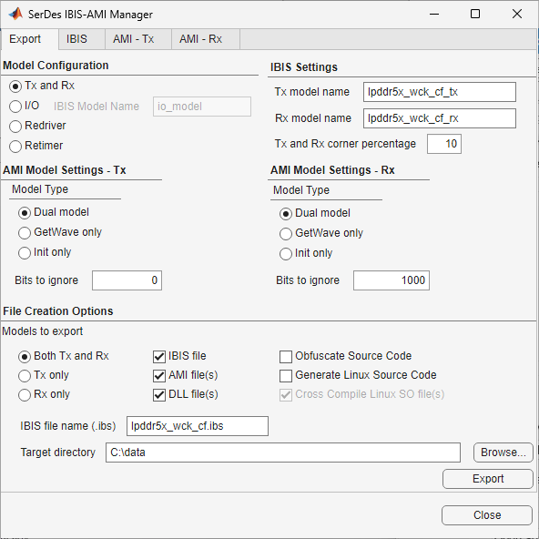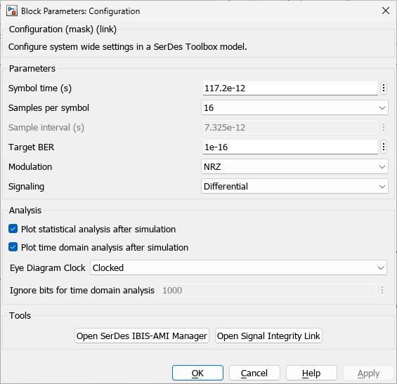 Open the Block Parameter dialog box for the Configuration block and click on the SerDes IBIS-AMI Manager button. In the IBIS tab inside the SerDes IBIS-AMI manager dialog box, the analog model values are converted to standard IBIS parameters that can be used by any industry standard simulator. In the AMI-Tx and AMI-Rx tabs in the SerDes IBIS-AMI manager dialog box, the reserved parameters are listed first followed by the model specific parameters following the format of a typical AMI file.