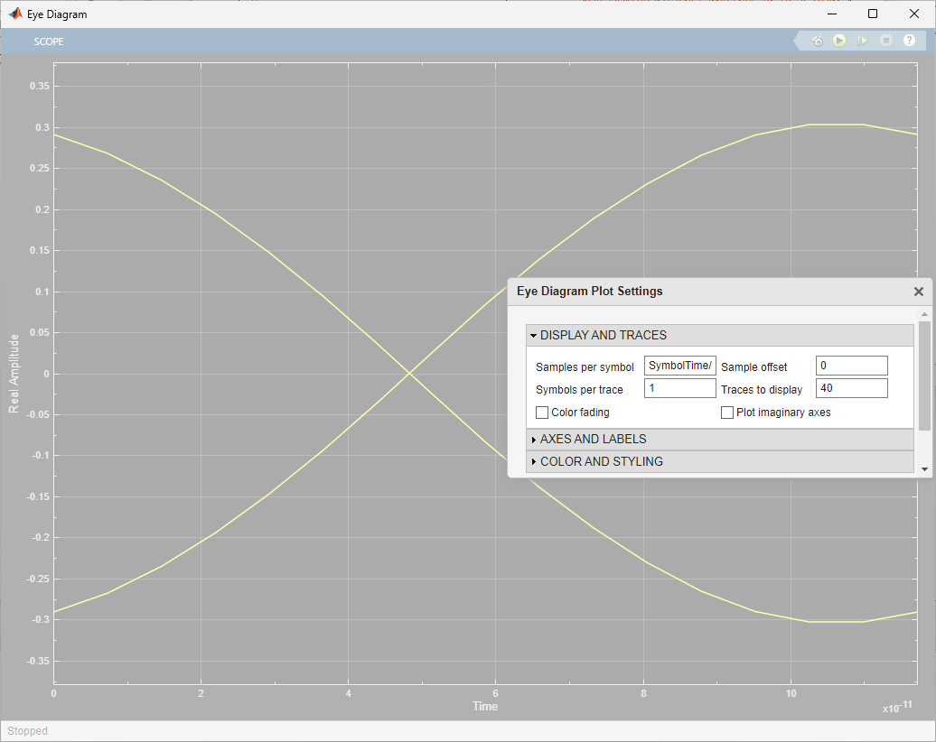 Note: Given that a binary pattern is being used for stimulus, it is recommended in the Time Domain plot settings menu, to set the option "Symbols per trace" to 1 to optimize visualization.