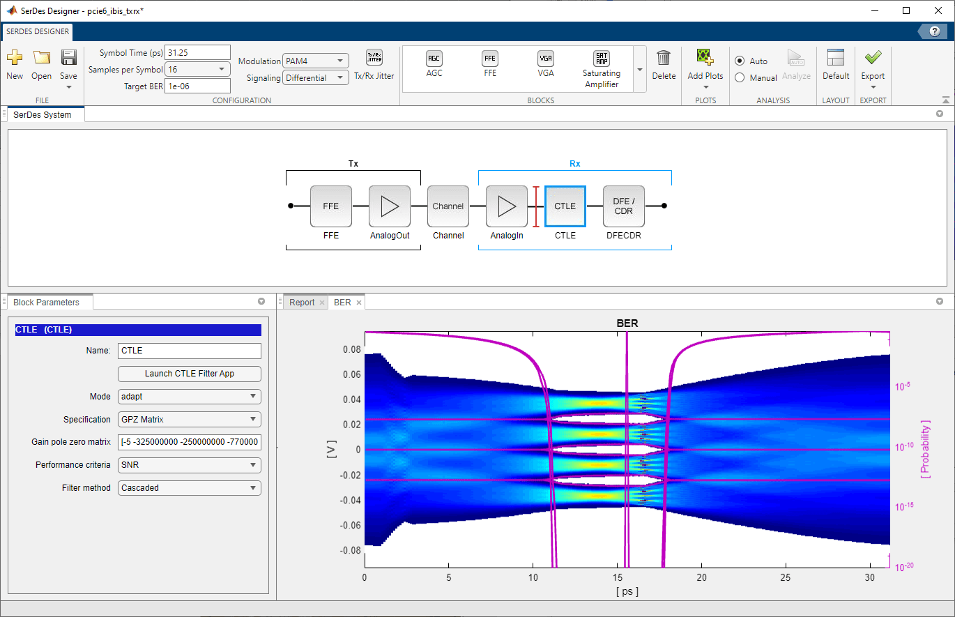The second part of this example takes the SerDes system exported by the SerDes Designer app and customizes it as required for PCIe Gen6 in Simulink. The following steps show how to configure the details of the system to prepare for exporting IBIS-AMI models.