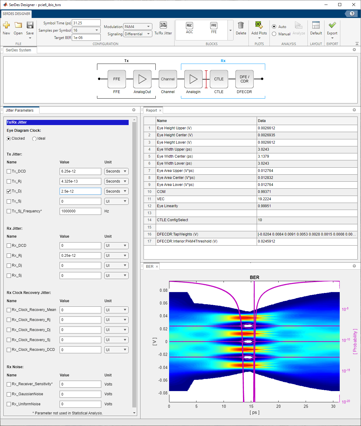 You can click on the Tx/Rx Jitter button on the toolstrip to view the Jitter Parameters tab. The Report tab you have open presently will enable you to observe how much the Statistical Eye Diagram and BER plot change as you enable or disable the various jitter types in the Jitter Parameters tab.