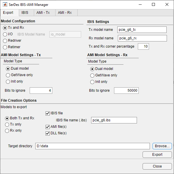50000to allow sufficient time for the Rx DFE taps to settle during time domain simulations.Set Models to export as Both Tx and Rx so that all the files are selected to be generated (IBIS file, AMI files and DLL files).