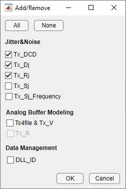 Before exporting to Simulink, re-enable Tx_DCD, Tx_Rj, Tx_Dj, and Rx_DCD, Rx_Rj, Rx_Dj. Enabling these jitter parameters automatically includes them in this SerDes System when exporting to Simulink. Later you will see how to change these to ranges and set each one to 0 as a default value.