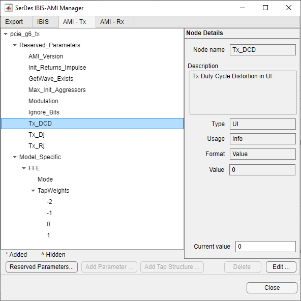 Open the AMI-Tx tab in the SerDes IBIS/AMI manager dialog box. Following the format of a typical AMI file, the reserved parameters are listed first followed by the model specific parameters.