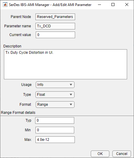 Note: These parameters will export as type "Float" with format "Value." After exporting to Simulink, you can change these to format "Range" using the IBIS-AMI Manager.