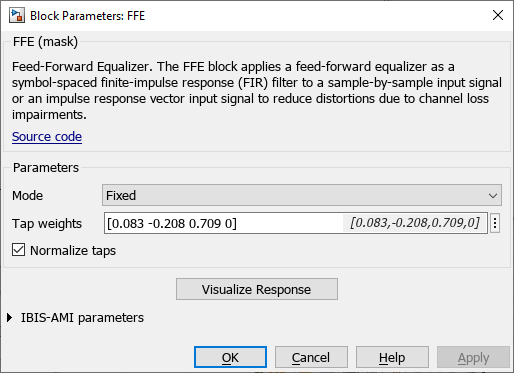 You can see that a new constant block has been added called FFEParameter.ConfigSelect. This is created automatically by the IBIS-AMI Manager when a new AMI Parameter is added. Next, you can follow these steps to re-configure the selection of tap weight presets for time domain (GetWave) simulation: