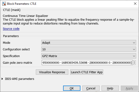 You can see from the loaded model, that the Rx CTLE block is setup for 11 configurations (0 through 10) to accommodate the Gain range of -5 to -15dB for this peaking filter. The code below shows you a method to find a GPZ Matrix for the CTLE block using the transfer equation provided by the PCIe Gen6 Base Specification (Equation 8-15):