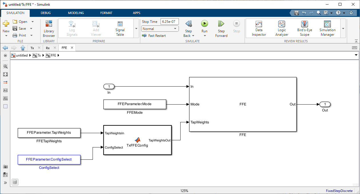 Re-wire the FFE sub-system so that the FFEParameter.TapWeights and FFEParameter.ConfigSelect constant blocks connect to the inputs of the newly defined TxFFEconfig MATLAB function block. The TapWeightsOut signal from the TxFFEconfig block connects to the TapWeights port of the FFE block.