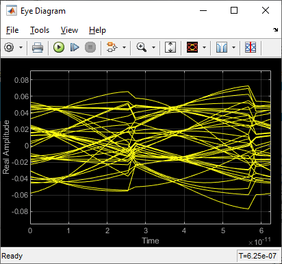 You can now run the model to simulate the SerDes System. Two plots are generated, the first is a live Time Domain (GetWave) eye diagram that is updated as the model is running.