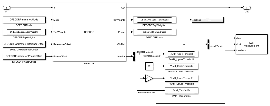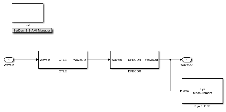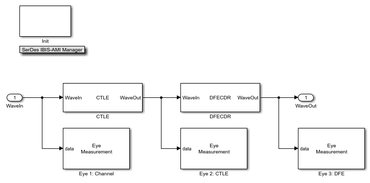 Open the model eyeMeasurementInDFECDRExampleModel attached with this example. The model was originally created in the SerDes Designer app and then exported to Simulink®. For more information, see Design SerDes System and Export IBIS-AMI Model (SerDes Toolbox).