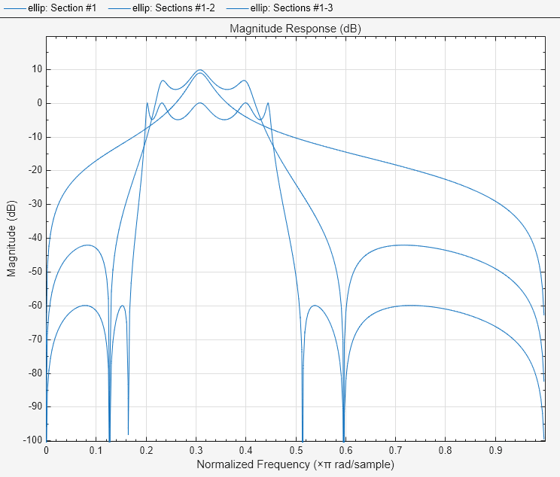 Add another display and show the cumulative magnitude responses of the cascaded transfer functions that specify the elliptic filter.