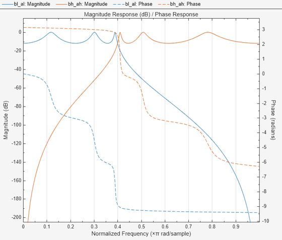 [zl,pl,kl] = cheby1(6,12,0.4); [bl,al] = zp2ctf(zl,pl,kl,SectionOrder=4); [zh,ph,kh] = cheby1(6,12,0.4,"high"); [bh,ah] = zp2ctf(zh,ph,kh,SectionOrder=4); filterAnalyzer(bl,al,bh,ah,OverlayAnalysis="phase")