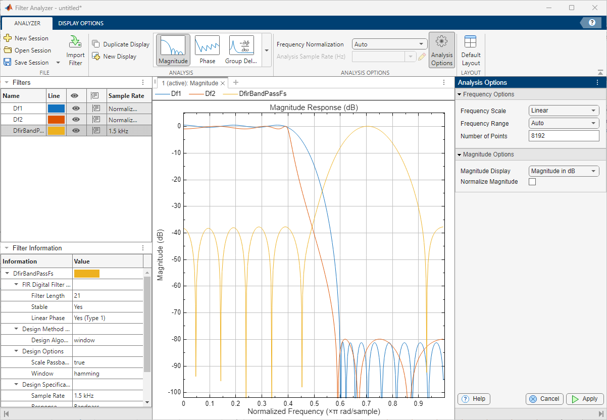 Import Filter.View, analyze, and compare responses of multiple digital filters. For more information, see