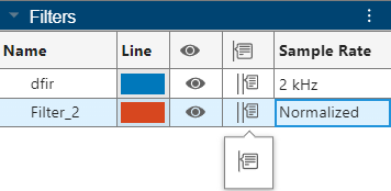 Eye — Click an entry in this column to add the corresponding filter to the current display or to remove it. You can also (since R2024b) drag filters from the Filters table onto any display for visualization.