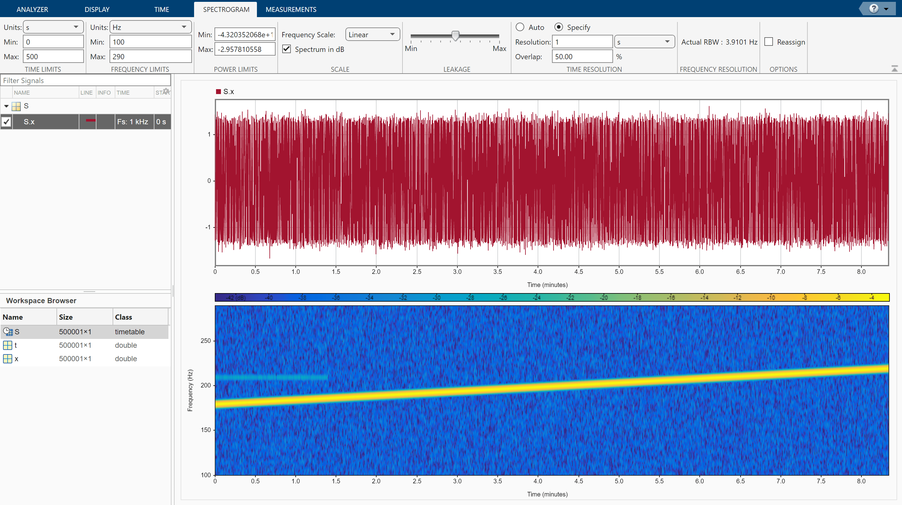 Open Signal Analyzer and drag the timetable from the Workspace Browser to a display. Click the Spectrogram/Time-Frequency button in the Views section of the Display tab to add a spectrogram view. On the Spectrogram tab, under Time Resolution, select Specify and enter a time resolution of 1 second. Set the Frequency Limits to 100 Hz and 290 Hz. Both signal components are visible.