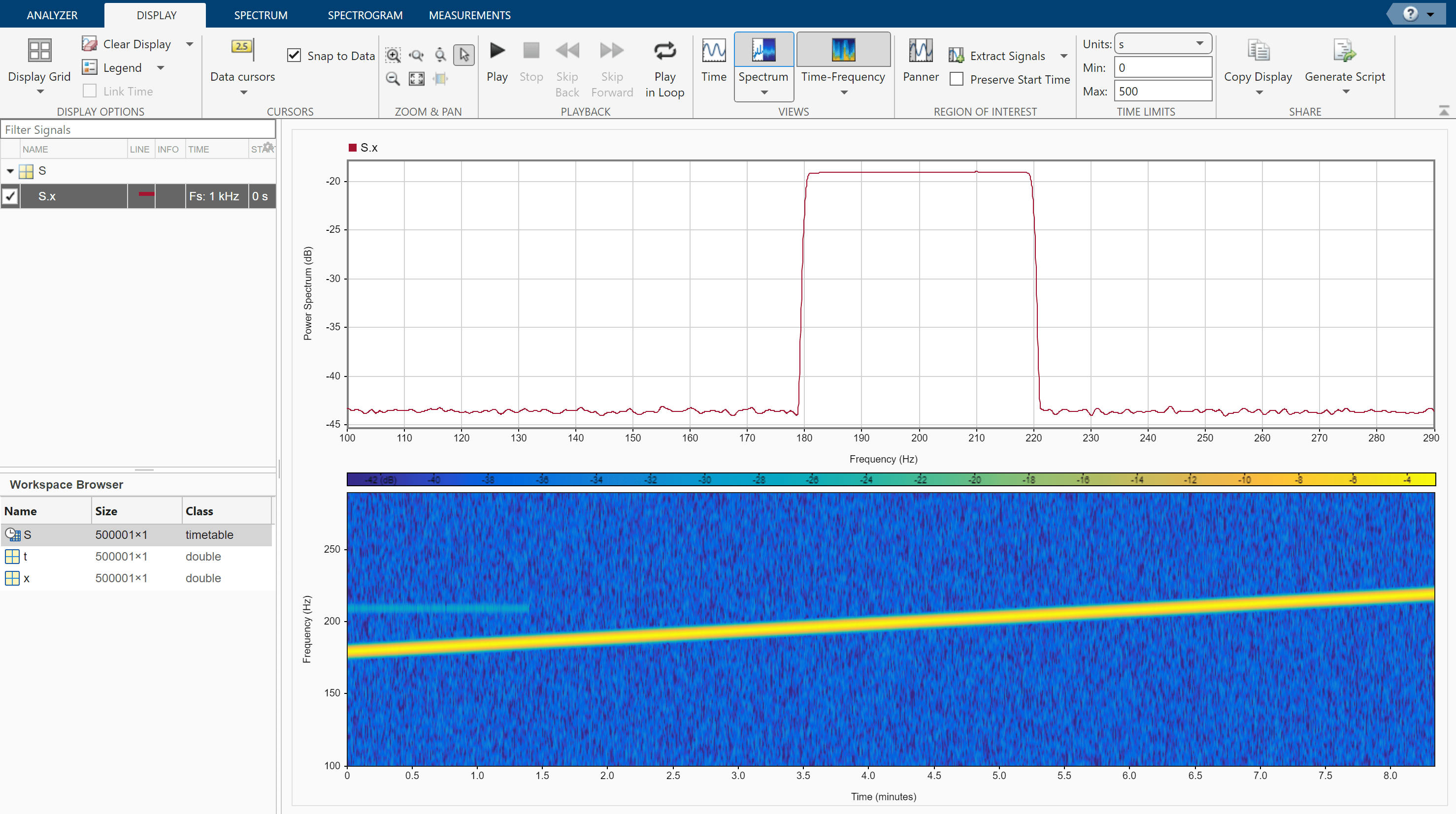 Go back to the Display tab. Click the Time button to remove the time view and click the Spectrum button to add a power spectrum view. The frequency range continues to be from 100 Hz to 290 Hz. The weak sinusoid is obscured by the chirp.