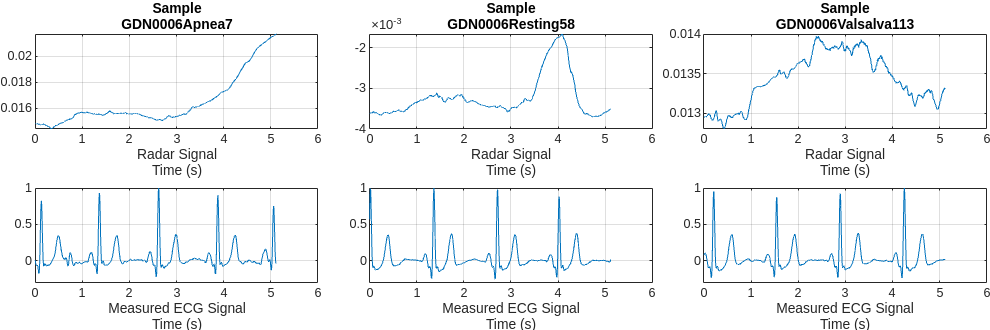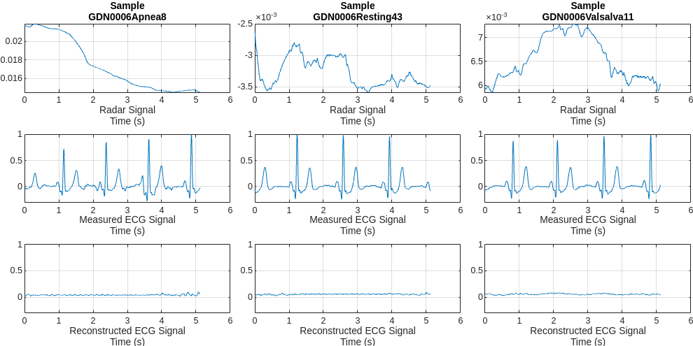 Radar is now being used for vital sign monitoring. This method offers many advantages over wearable devices. It allows non-contact measurement which is preferred for use in cases of daily use of long-term monitoring. However, the challenge is that we need to convert radar signals to vital signs or to meaningful biosignals that can be interpreted by physicians. Current traditional methods based on signal transform and correlation analysis can capture periodic heartbeats but fail to reconstruct the ECG signal from the radar returns. This example shows how AI, specifically a deep learning network, can be used to reconstruct ECG signals solely from the radar measurements.