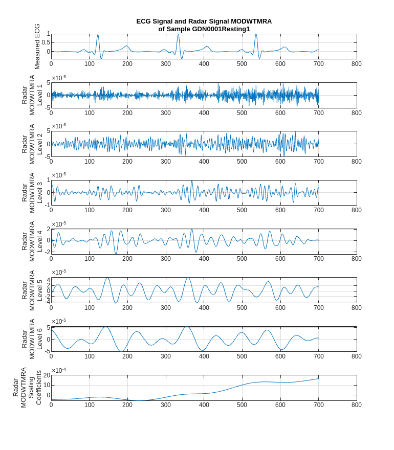 title(["ECG Signal and Radar Signal MODWTMRA", "of Sample " + regexprep(name, {'_','radar'}, '')])