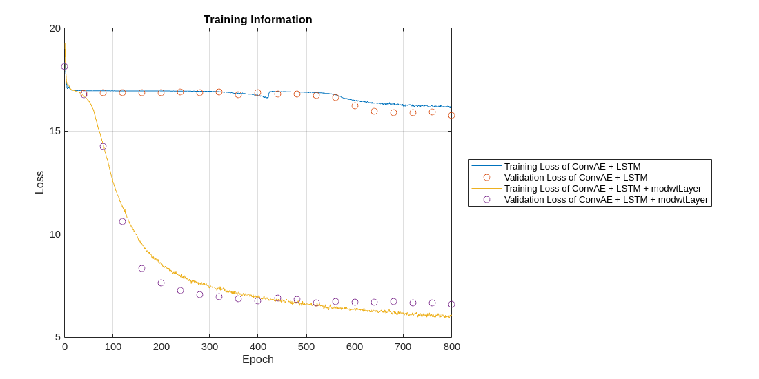figure plot(info1.TrainingHistory,"Iteration","Loss") hold on scatter(info1.ValidationHistory,"Iteration","Loss") plot(info2.TrainingHistory,"Iteration","Loss") scatter(info2.ValidationHistory,"Iteration","Loss") hold off legend(["Training Loss of ConvAE + LSTM", ... "Validation Loss of ConvAE + LSTM", ... "Training Loss of ConvAE + LSTM + modwtLayer",... "Validation Loss of ConvAE + LSTM + modwtLayer"],"Location","eastoutside") xlabel("Epoch") grid on title("Training Information") set(gcf,'Position',[0 0 1000,500]);