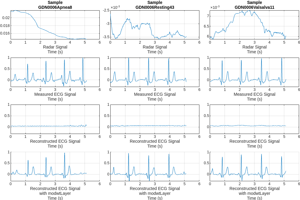 This example implements a convolutional autoencoder and BiLSTM network to reconstruct ECG signals from CW radar signals. The example analyzes the performance of the model with and without a MODWT Layer. It shows that the introduction of MODWT layer improves the quality of the reconstructed ECG signals.