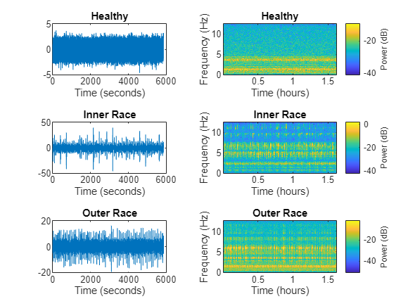 healthySignal = read(subset(sds,1)); innerRaceFaultSignal = read(subset(sds,13)); outerRaceFaultSignal = read(subset(sds,34)); fs = 25; figure tiledlayout(3,2) nexttile plot((0:numel(healthySignal)-1)/fs,healthySignal) xlabel("Time (seconds)") title("Healthy") nexttile pspectrum(healthySignal,fs,"spectrogram",Leakage=0.9) title("Healthy") nexttile plot((0:numel(innerRaceFaultSignal)-1)/fs,innerRaceFaultSignal) xlabel("Time (seconds)") title("Inner Race") nexttile pspectrum(innerRaceFaultSignal,fs,"spectrogram",Leakage=0.9) title("Inner Race") nexttile plot((0:numel(outerRaceFaultSignal)-1)/fs,outerRaceFaultSignal) xlabel("Time (seconds)") title("Outer Race") nexttile pspectrum(outerRaceFaultSignal,fs,"spectrogram",Leakage=0.9) title("Outer Race")