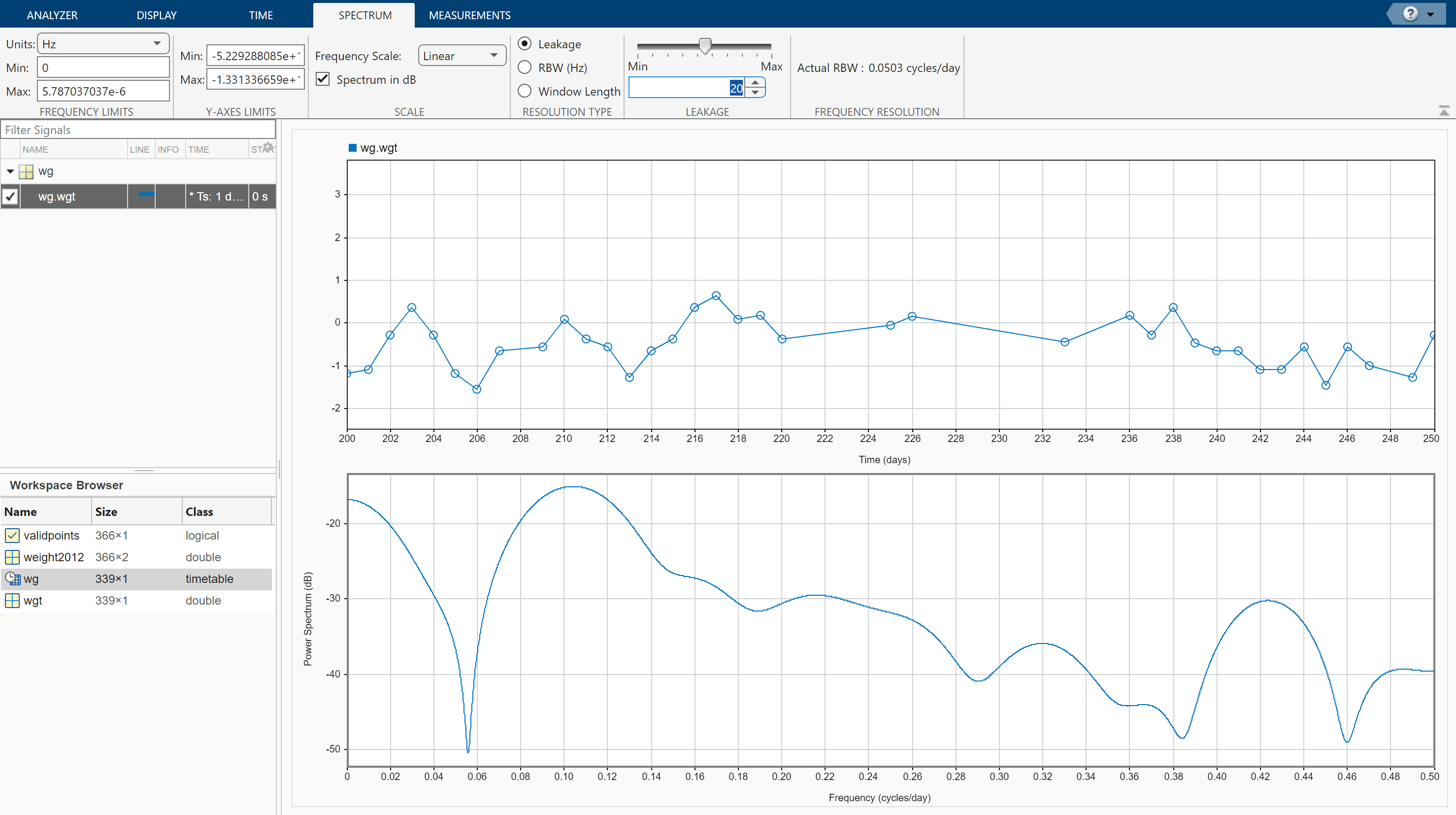 Open Signal Analyzer and drag the timetable to a display. On the Display tab, click Spectrum to open a spectrum view. On the Time tab, select Show Markers. Zoom into the missing stretch by setting the Time Limits to 200 and 250 days.