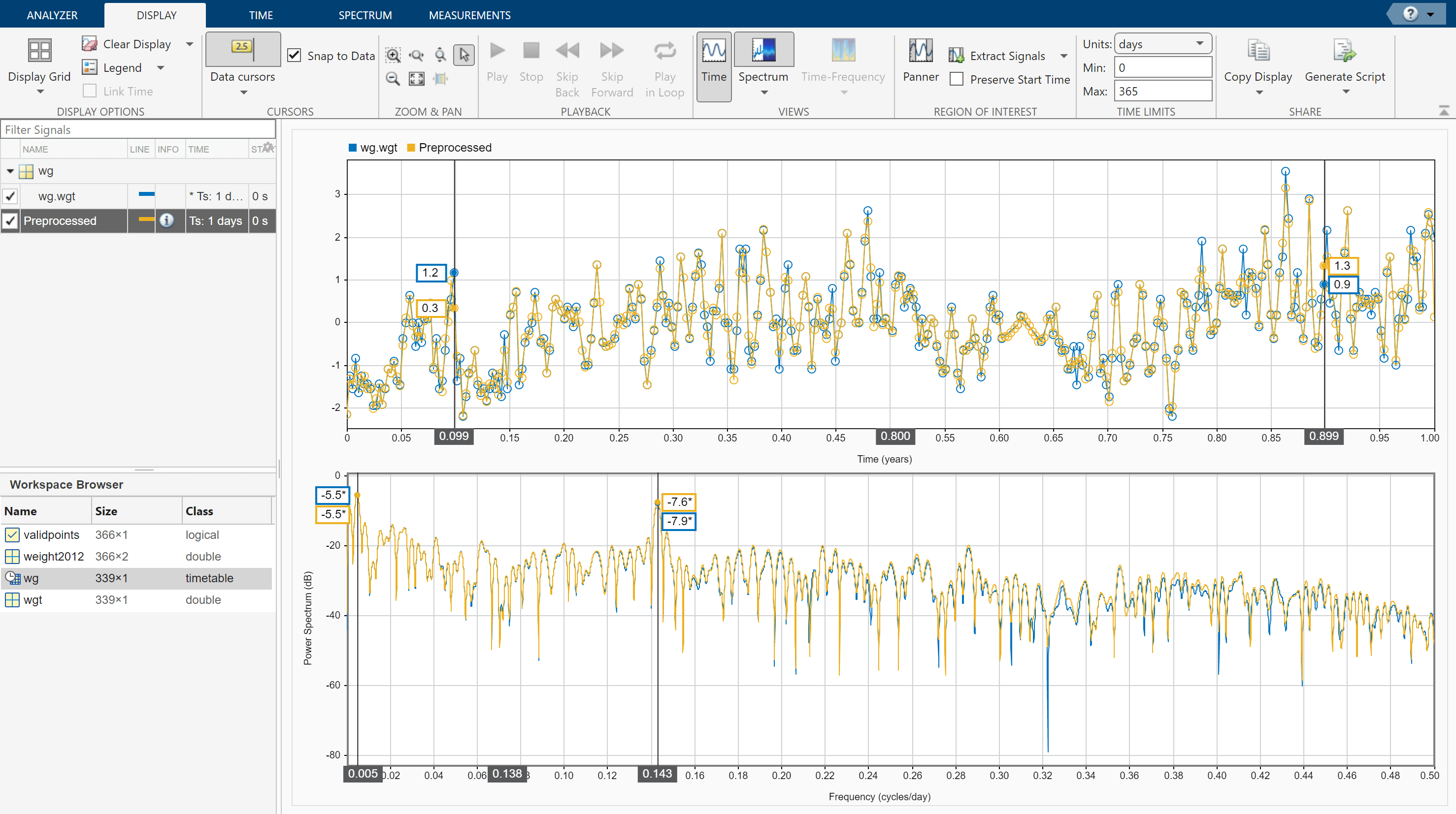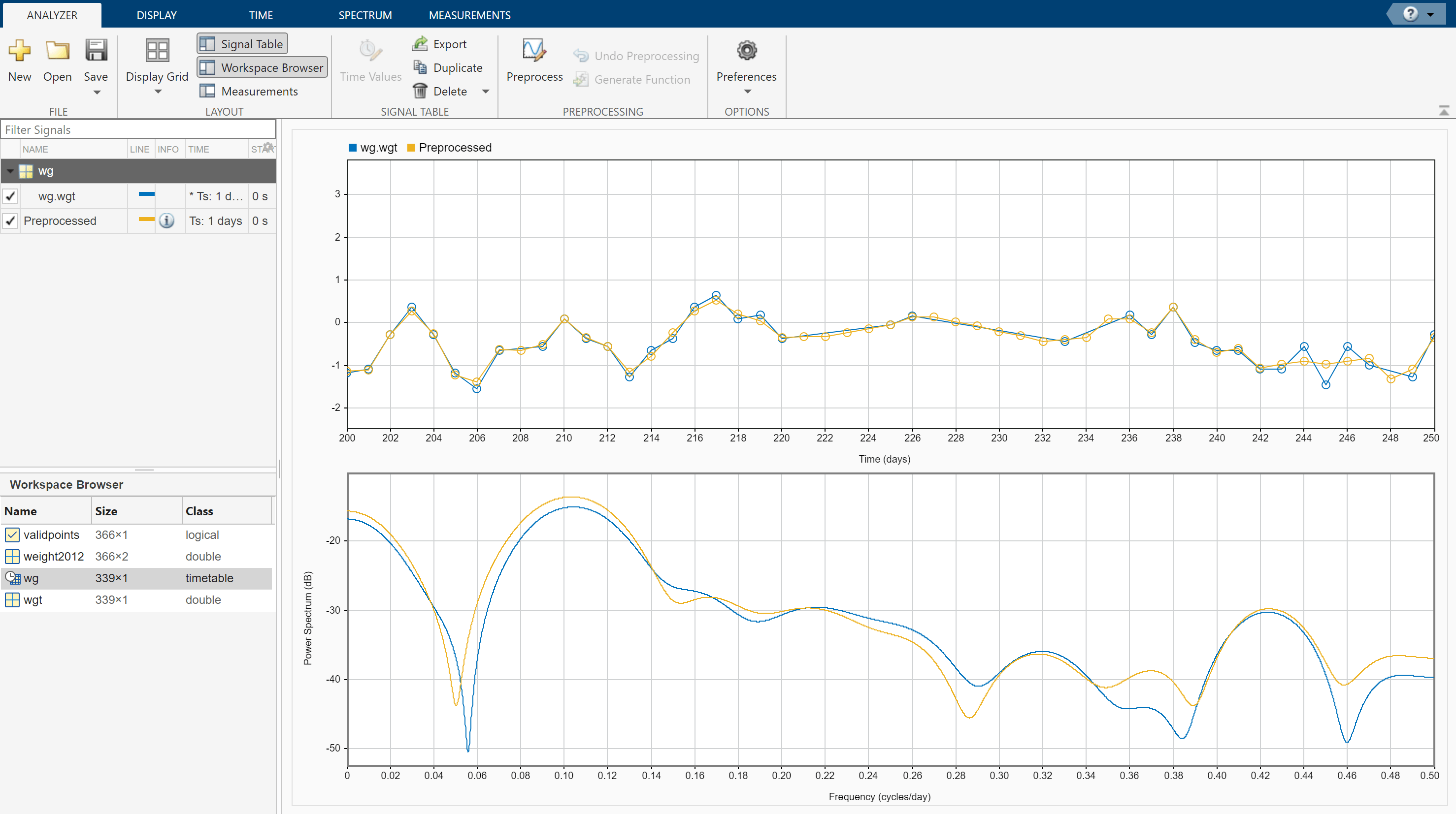 The preprocessed signal shows less fluctuation than the original. The shape of the signal suggests the person's weight varies less in the summer months than in winter, but that may be an artifact of the resampling. Click the icon on the Info column in the Signal table entry for the Preprocessed signal to see the preprocessing steps performed on it.