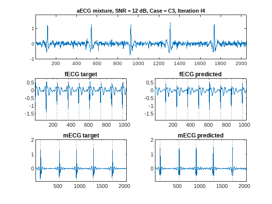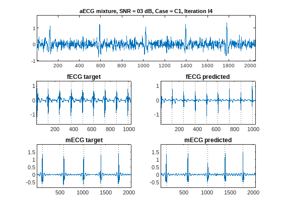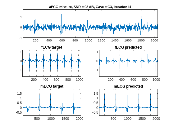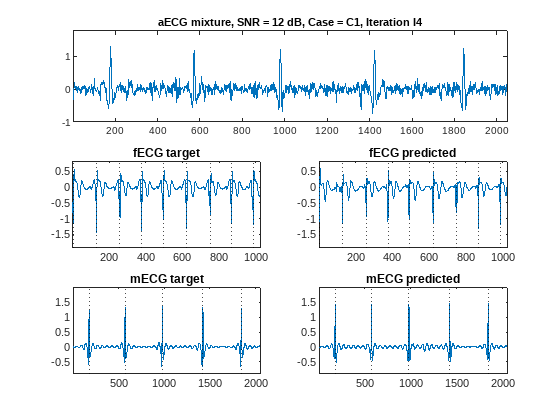 Recall that the main purpose of this network is to extract fetal ECG signals, which are the most difficult to obtain from the mixture. In the W-Net architecture the primary target is the one estimated by the left U-Net branch, which corresponds to the first output of the network built in this example using the modelLoss function. Overall, the network does a very good job in estimating QRS peak locations and waveform shapes for both high- and low-SNR cases and different measurement conditions.