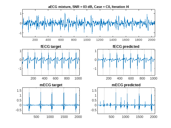 Call the predict method of the trained network to get separated mECG and fECG signals from an aECG input. Take for example iteration 3 of case C1 with and SNR of 9 dB. Estimate the fetal and maternal waveforms for that case as follows.