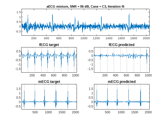 There are extreme measurement cases where the combination of noise, fetal movements, and heart rate variations are too severe for the network. For example, plot the ECG estimates for an SNR of 6 dB, measurement case C3, and iteration 5. In this case, the network fails to predict an acceptable fECG waveform.