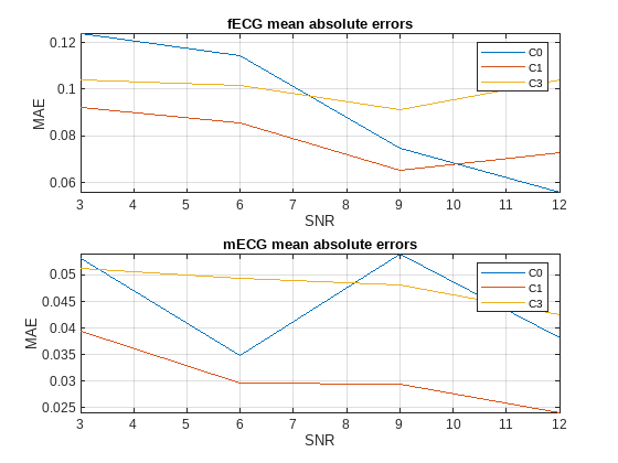 This function computes the mean absolute error between actual fECG and mECG signals and predicted ones for all SNR values, measurement cases, and iterations of subject 10.
