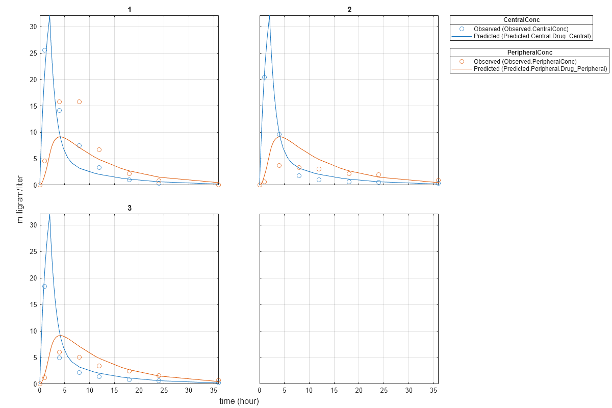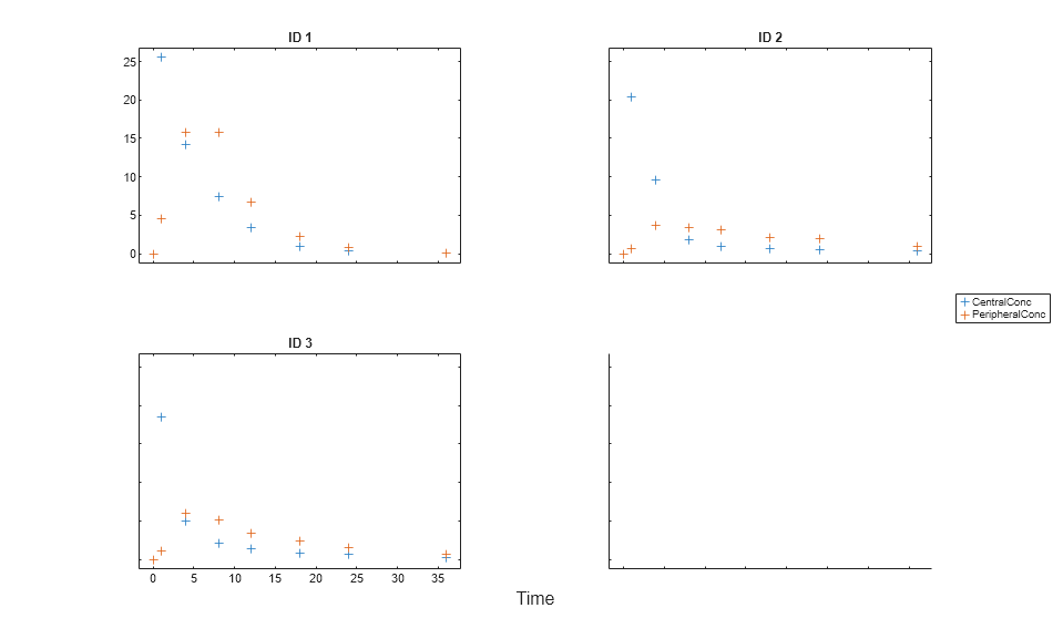 sbiotrellis(gData,'ID','Time',{'CentralConc','PeripheralConc'},... 'Marker','+','LineStyle','none');