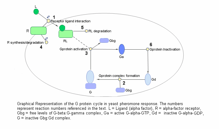 In the yeast Saccharomyces cerevisiae, G protein signaling in pheromone response is a well characterized signal transduction pathway. The pheromone secreted by alpha cells activates the G protein-coupled α-factor receptor (Ste2p) in a cells which results in a variety of cell responses including cell-cycle arrest and synthesis of new proteins. The authors of the study performed a quantitative analysis of this cycle, compared the regulation of G protein activation in wild-type yeast haploid a cells with cells containing mutations that confer supersensitivity to α-factor. They analyzed the data in the context of cell-cycle arrest and pheromone-induced transcriptional activation and developed a mathematical model of the G protein cycle that they used to estimate rates of activation and deactivation of active G protein in the cell.