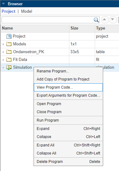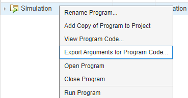In the Browser panel, right-click Simulation and select Export Arguments for Program Code.