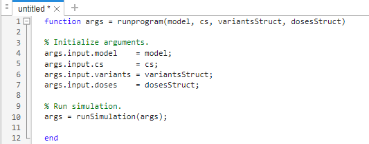 It opens an untitled MATLAB function file containing the code for the program. Save the file to a local directory in your computer using the default file name (runprogram.m).